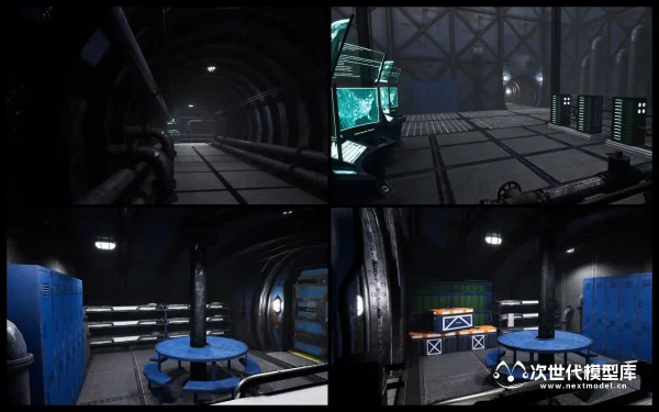 水下海洋站:专为恐怖、科幻等第一人称游戏开发而设计的模块化环境。集大成者simplegon生成的网格和道具对象,提供全面的LOD支持。巨大的模块化房间区域可打造各类迷宫状场景,自由组合房间与走廊。支撑系统同样模块化,支持垂直移动。大厅系统分方形和管状,前者见施工演示,后者呈现于渲染视频与图像中。船员宿舍、食堂、淋浴与通讯室等房间作为集合对象,独立于模块区域。这些房间在模块外很少重复使用。