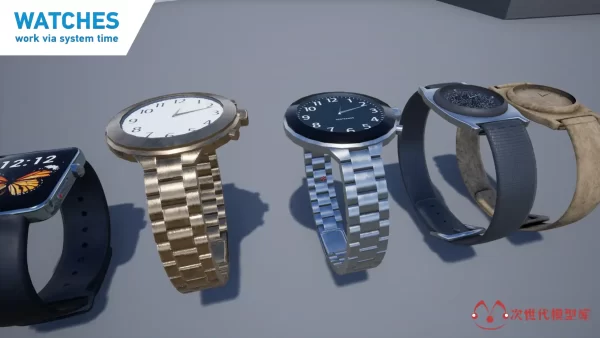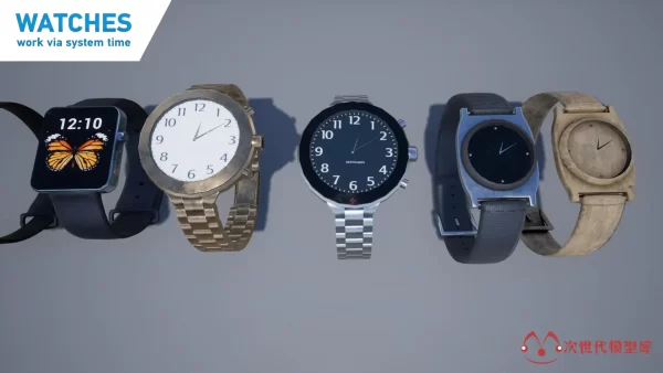 实时工作的逼真手表。 您也可以在 VR 游戏中使用它们。 资产包括 7 款不同的手表: 4 款经典手表、2 款智能手表和 1 款未来手表。纹理包括法线贴图、粗糙度贴图、金属贴图和 AO 的 PBR 材质。 技术参数: 资产体积:93MB 纹理尺寸:4096x4096 碰撞:有 LOD:有 顶点数:最大~3600 网格数:20 材质和材质实例的数量: 12 纹理数量: 26 资源格式:UE资源包 支持UE版本:4.27, 5.0 - 5.2