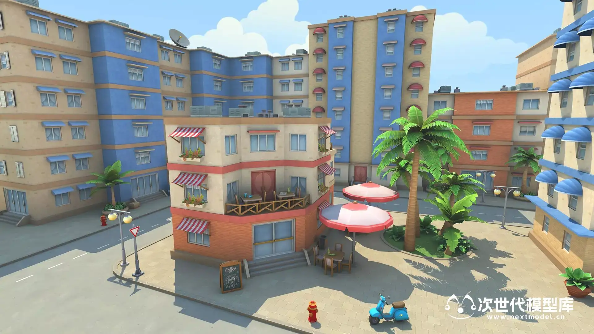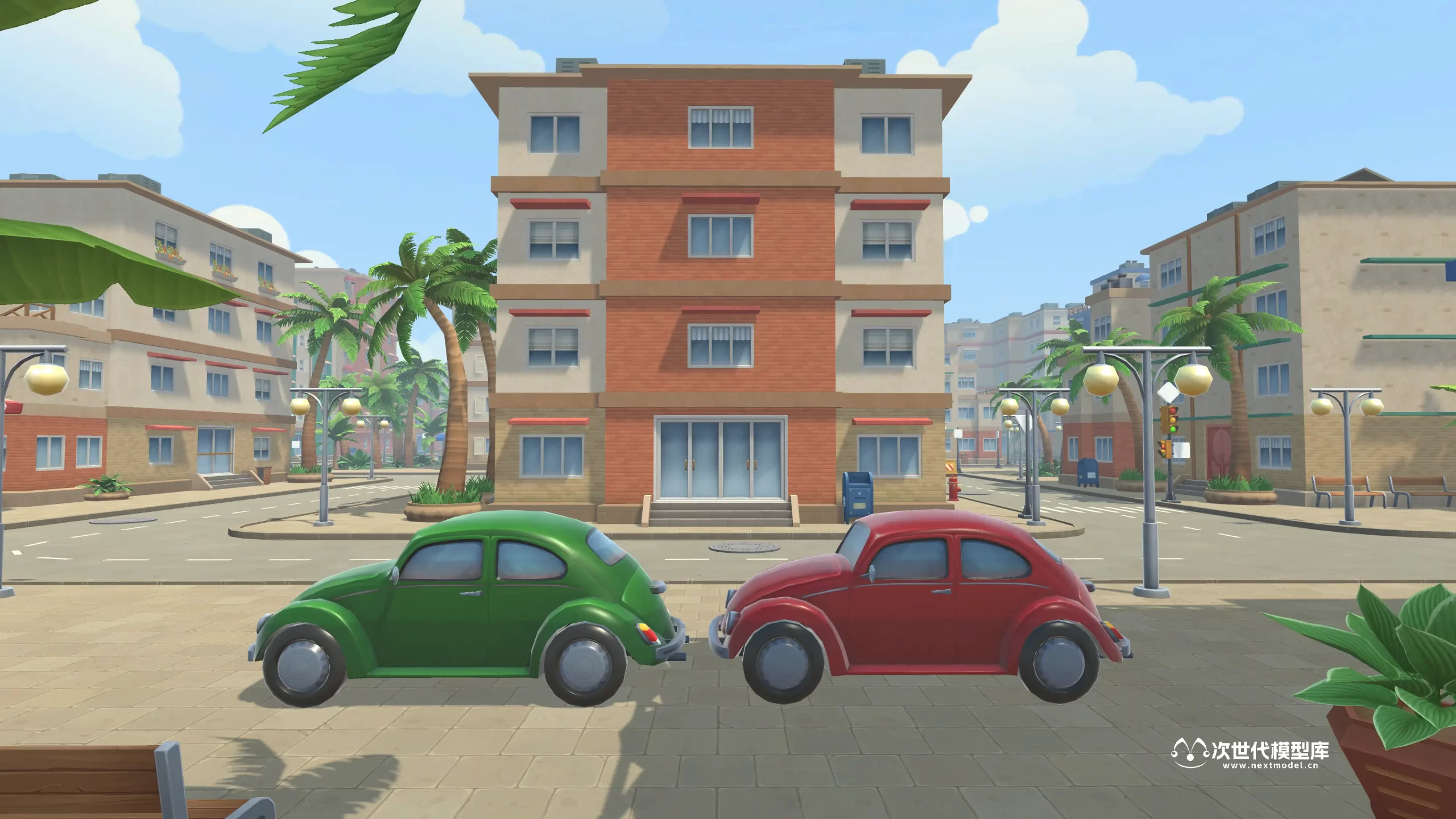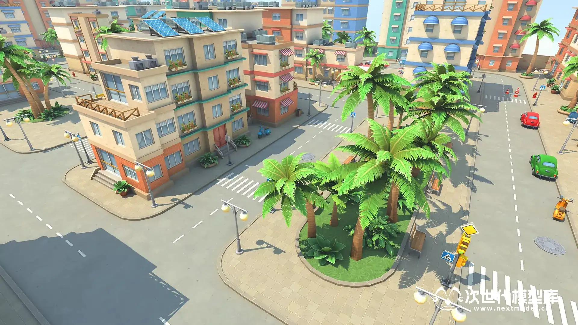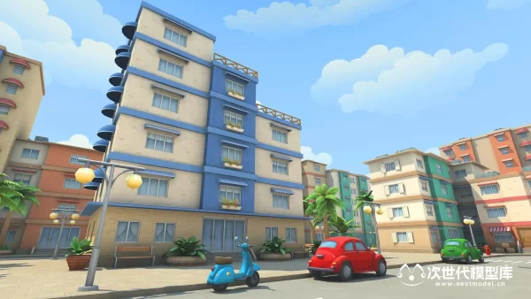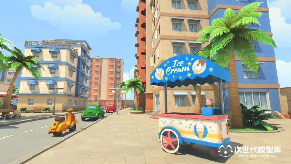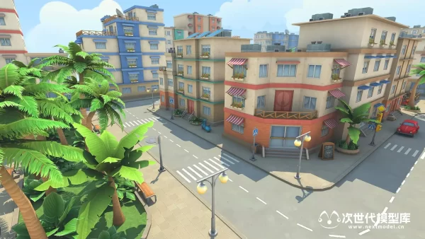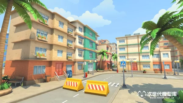 模型包括超过了80种预制体,10座不同的建筑物;棕榈树、灌木丛和草地;大量障碍物和道具;道路和人行道;卡通风格天空盒等;