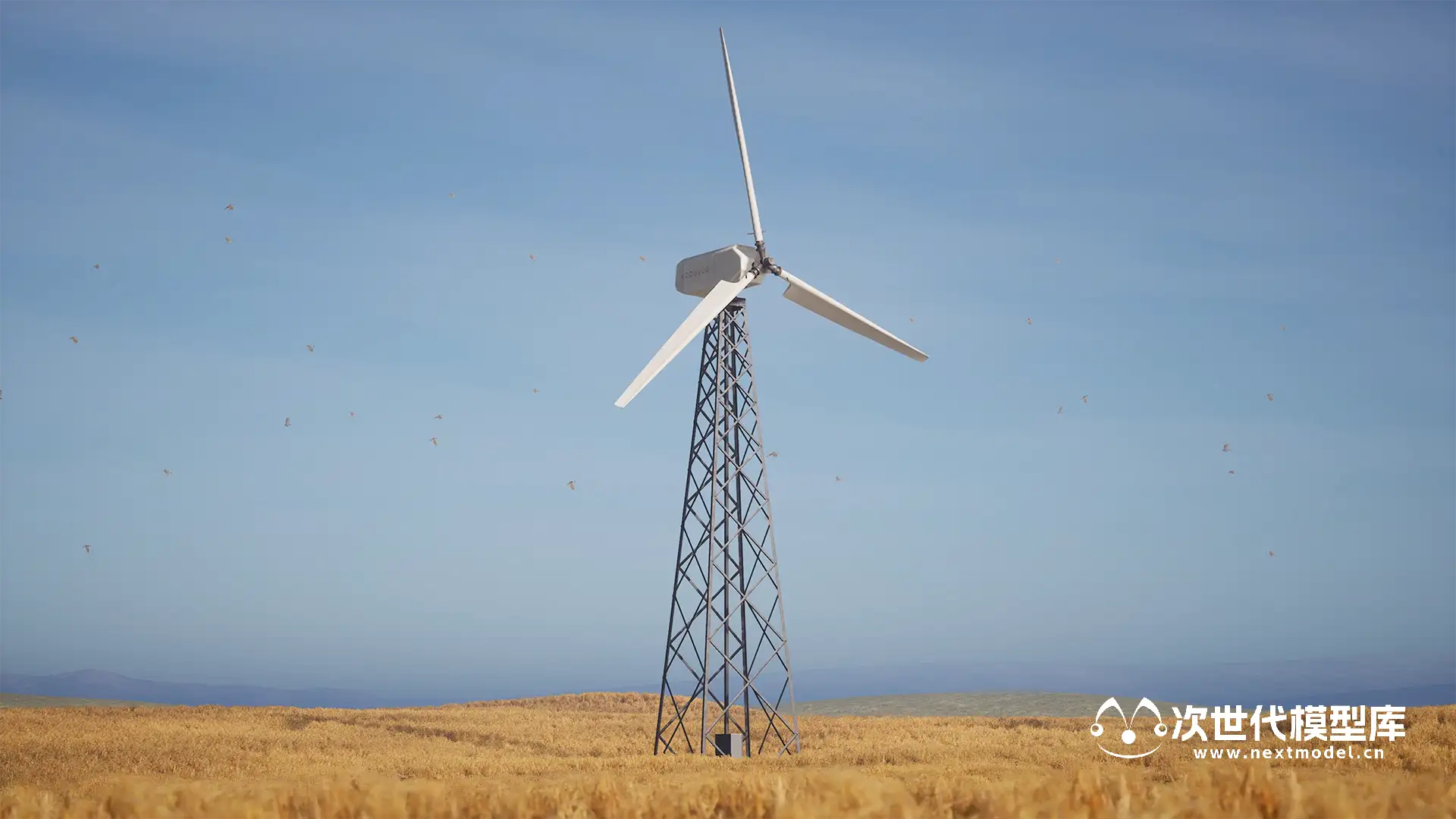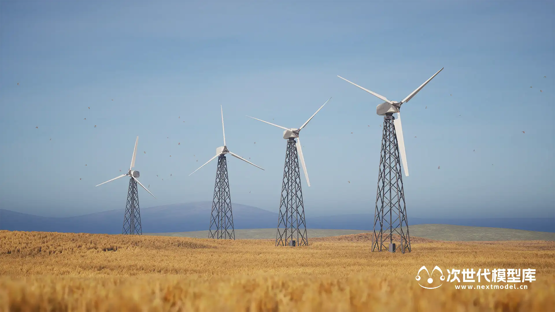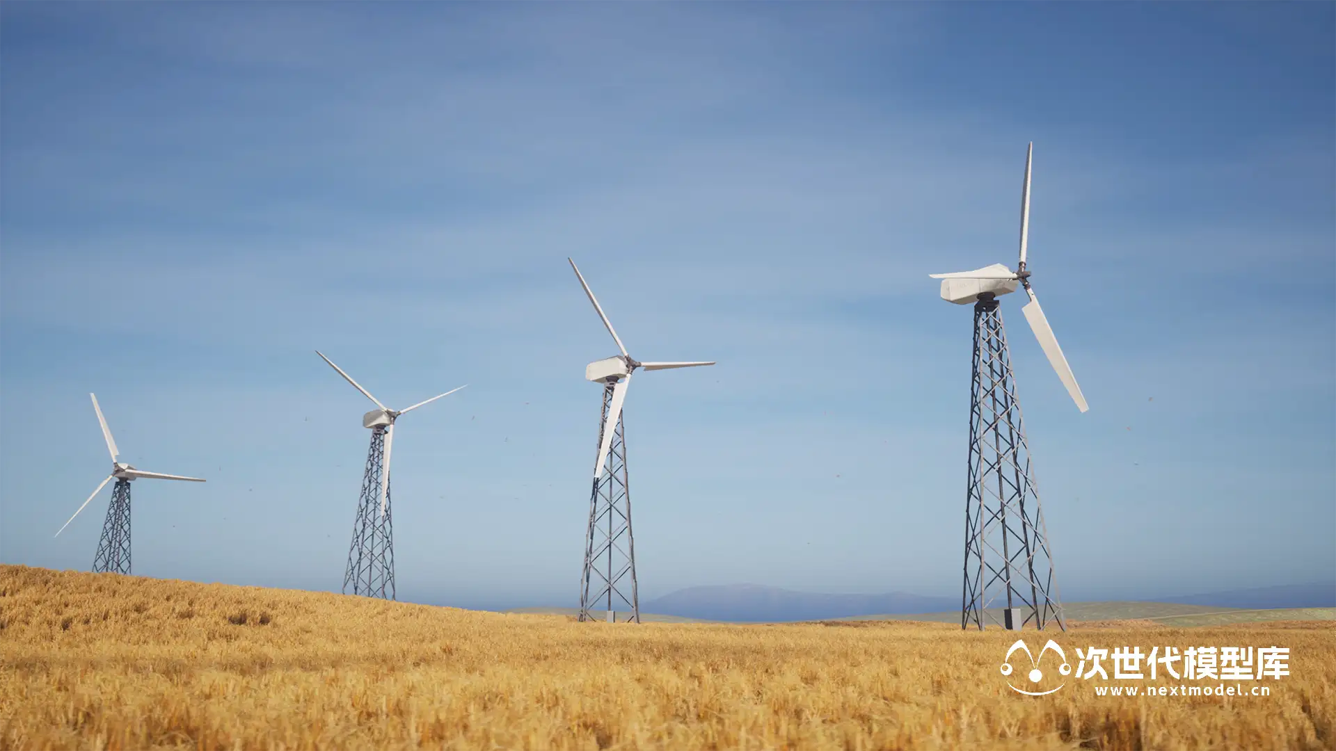 超写实的老式涡轮风力发电机(Wind Turbines)模型,模型由钢架结构、电机外壳、转子、叶片。场景还包括其他模型道具:1组低多边形小麦模型,5个背景山模型、6组石头、1个道路、1个模拟麻雀飞行的粒子、1套地形景观及其材质。2组场景实例-白天、日落。