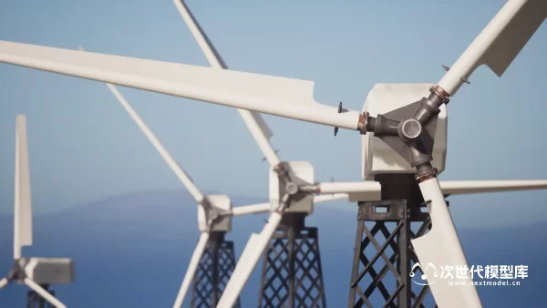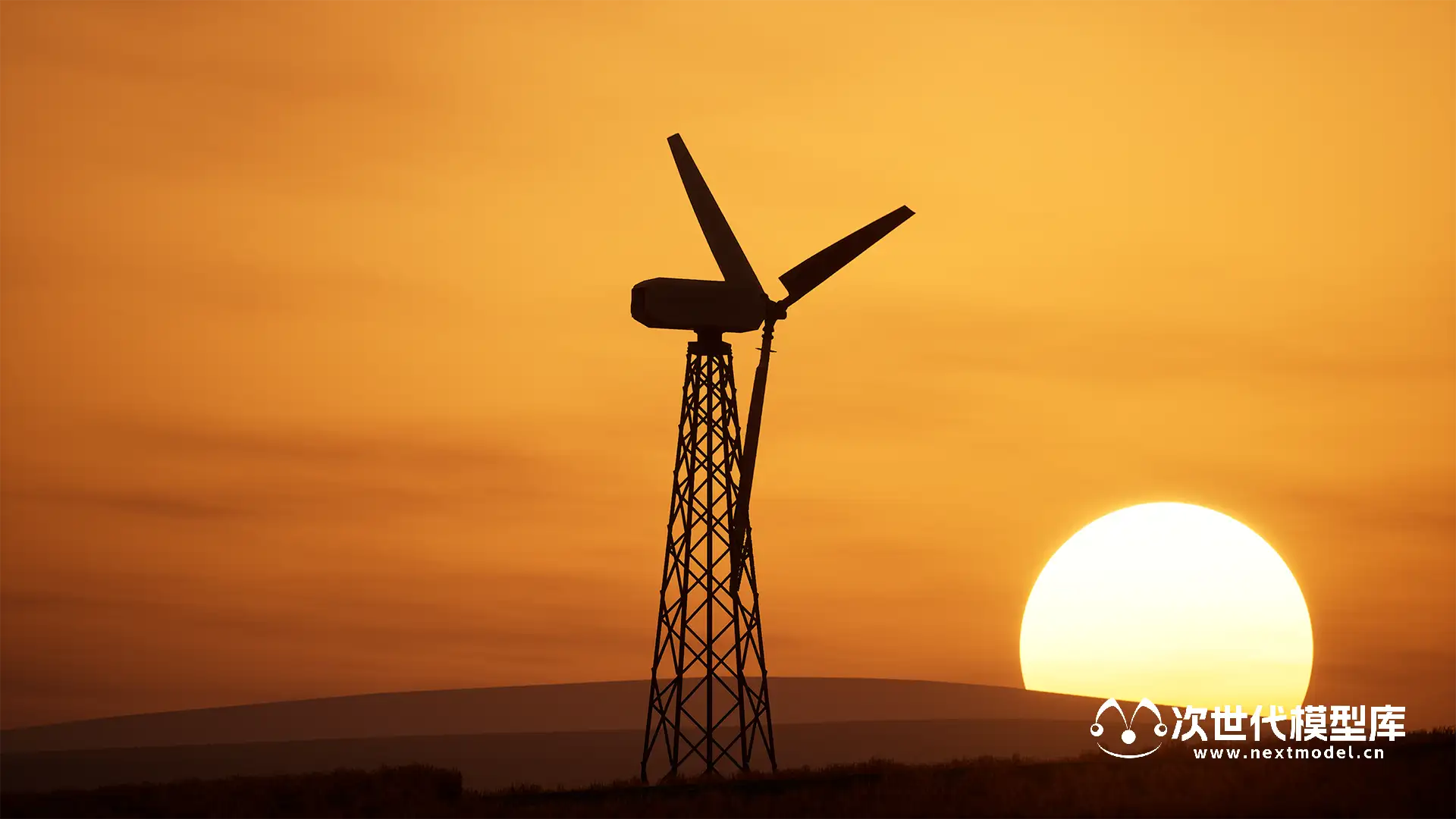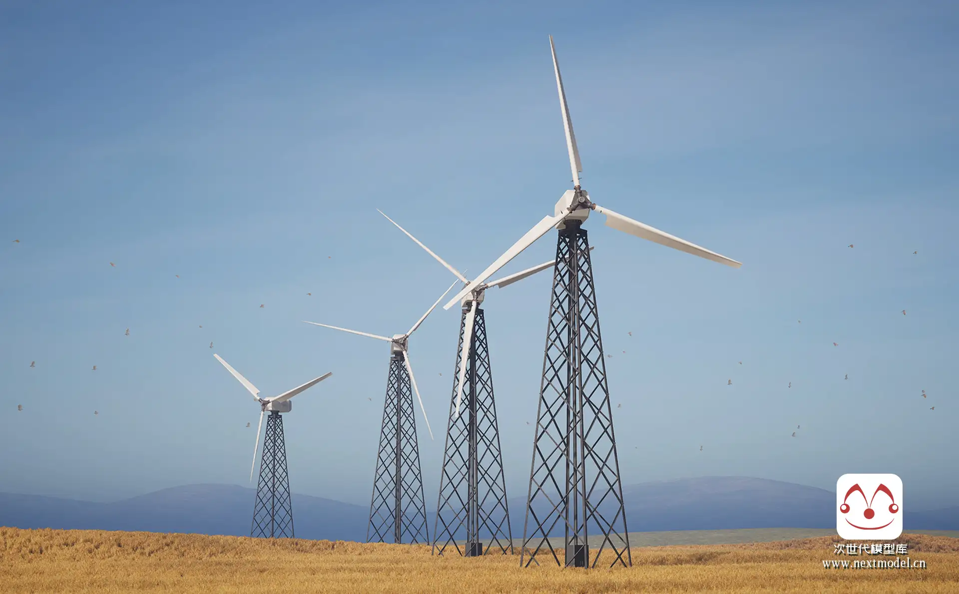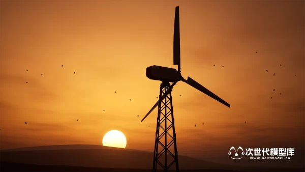 超写实的老式涡轮风力发电机(Wind Turbines)模型,模型由钢架结构、电机外壳、转子、叶片。场景还包括其他模型道具:1组低多边形小麦模型,5个背景山模型、6组石头、1个道路、1个模拟麻雀飞行的粒子、1套地形景观及其材质。2组场景实例-白天、日落。