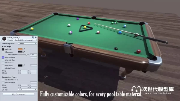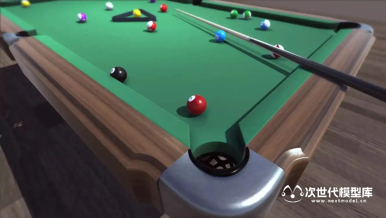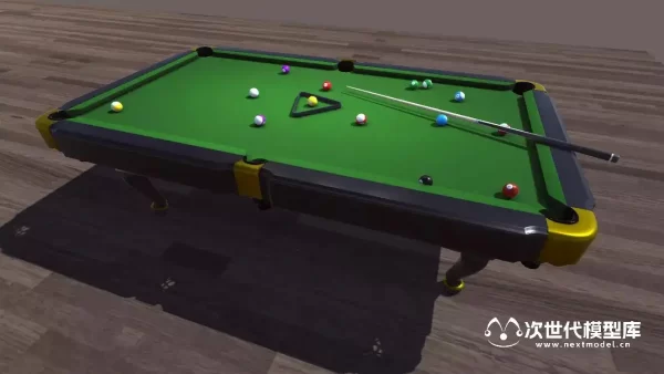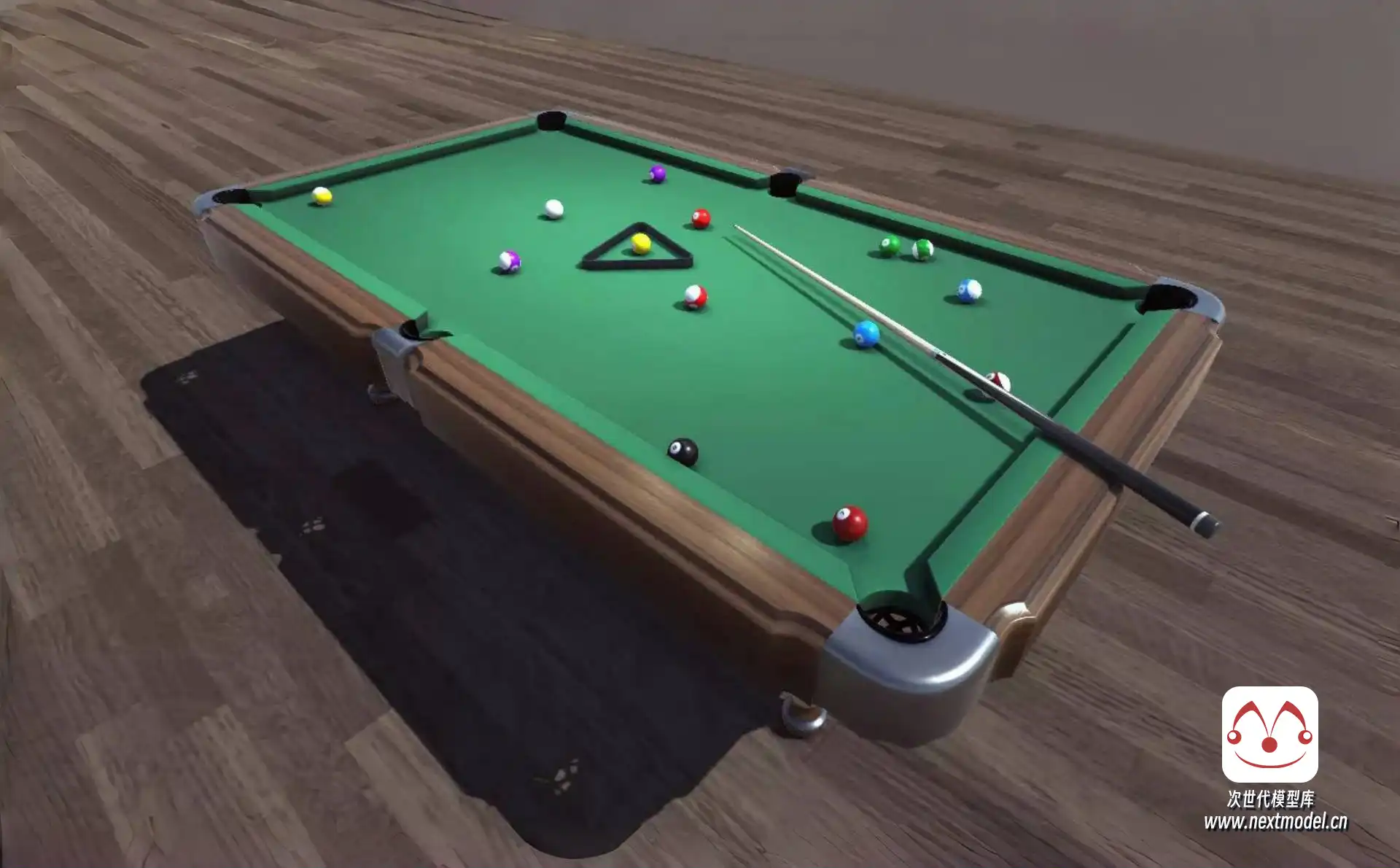 一套完整的台球桌模型,包括台球桌本身(约20k多边形)、1至15号台球(每个约1k多边形)、三角形架(200多边形)以及台球杆(650多边形)。此外,还包括地砖模型(2多边形)。台球桌模型采用切肉刀纹理系统,支持自定义颜色,所有材料都是独立分层的,方便用户进行颜色调整。