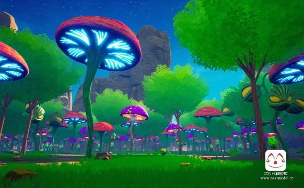 奇幻卡通风格沙漠环境中的蘑菇森林场景