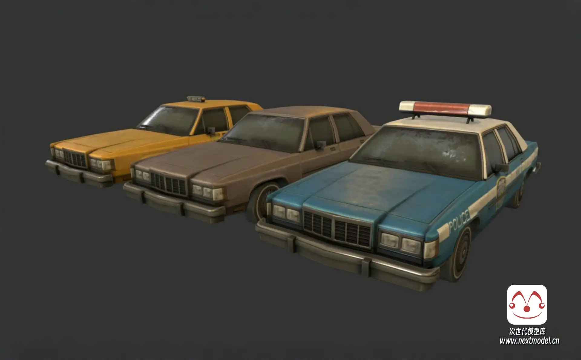 一辆基于 1980 年代几款车型的通用汽车模型,在通过修改贴图的情况下改造为警车和出租车。模型面数为四边面3.3k。采用PBR纹理,尺寸1024~2048,共7张。