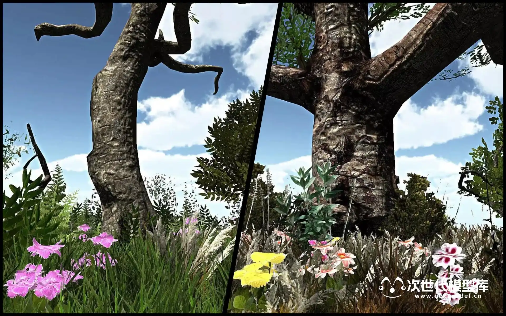 包含10棵树木、3个灌木、16种植物、2棵棕榈树、4个蘑菇、11朵花、2种蕨类植物、6种草、4棵蘑菇树以及向日葵。植被以两种形式呈现,一种是带LOD的预制件(用于手动放置),另一种是纹理形式(用于在地形上进行绘制)。