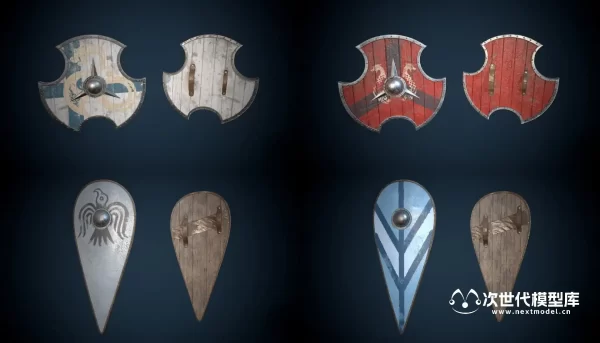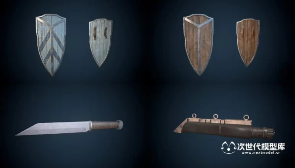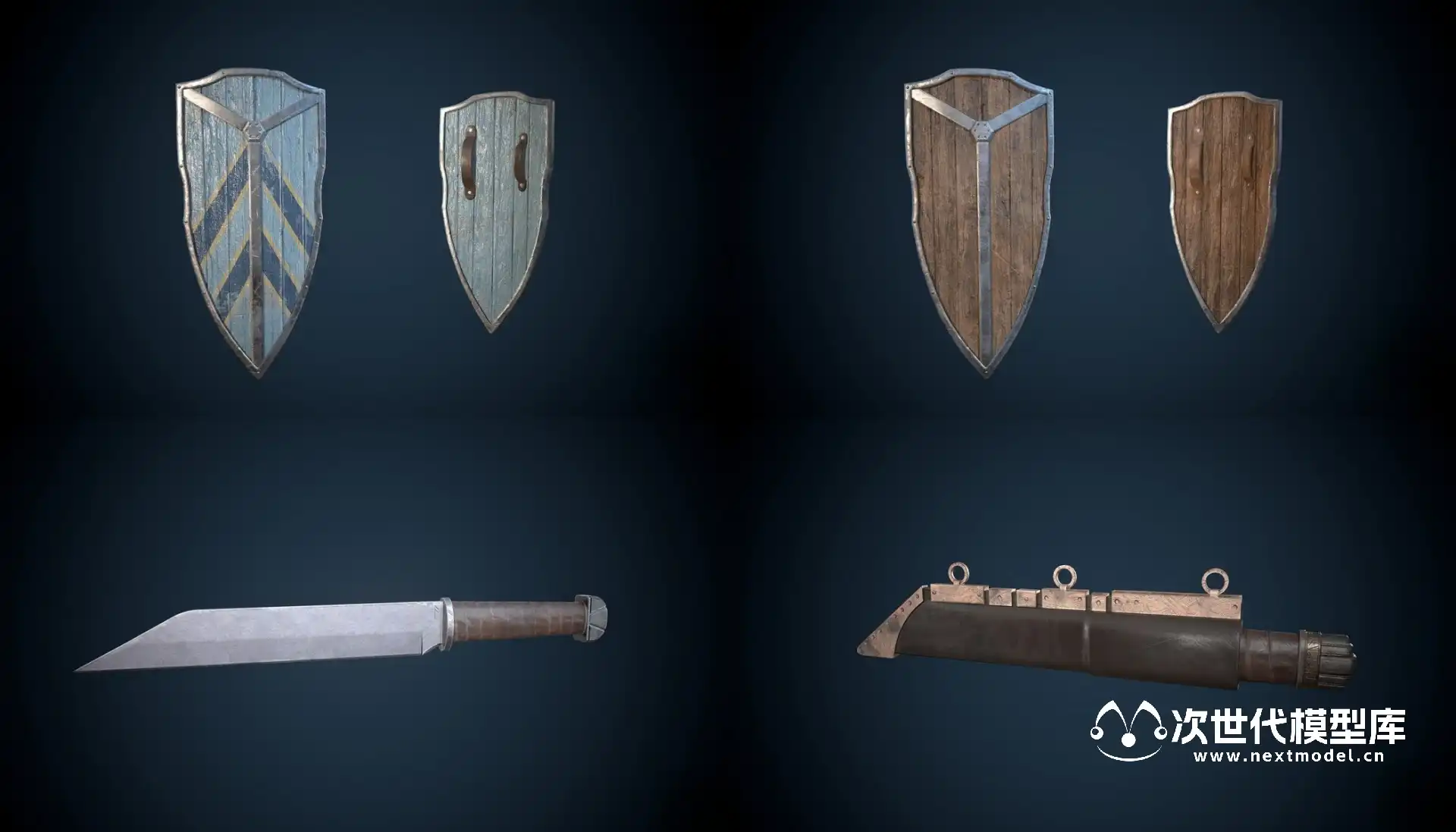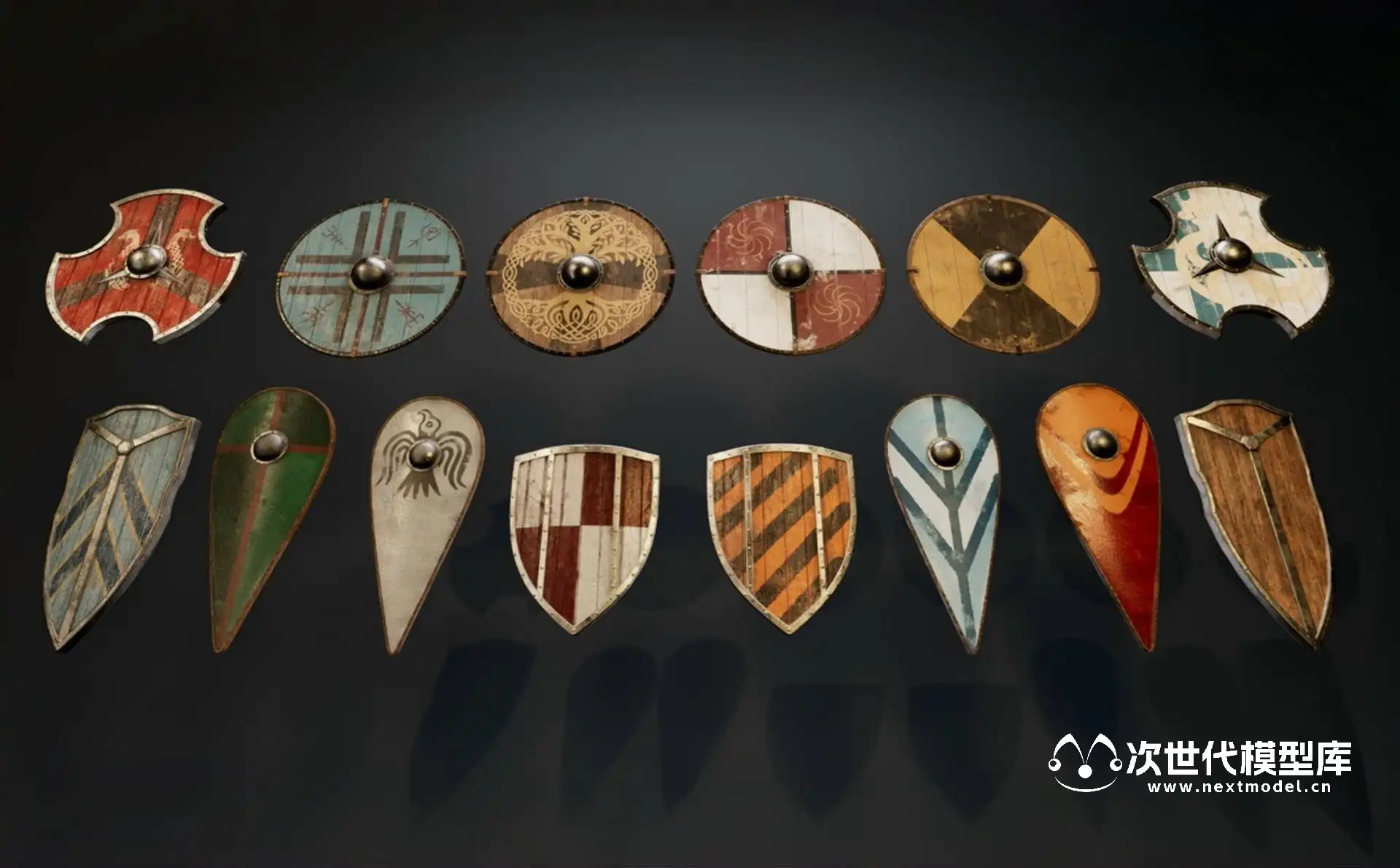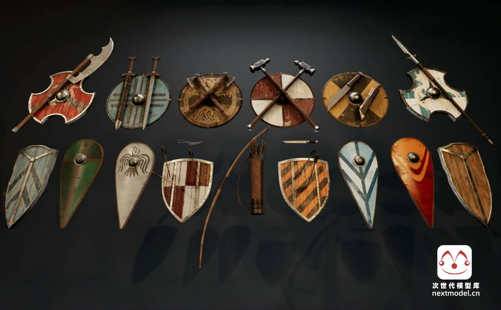- 18件中世纪/维京武器和盾牌,每个盾牌有3种材质变化。