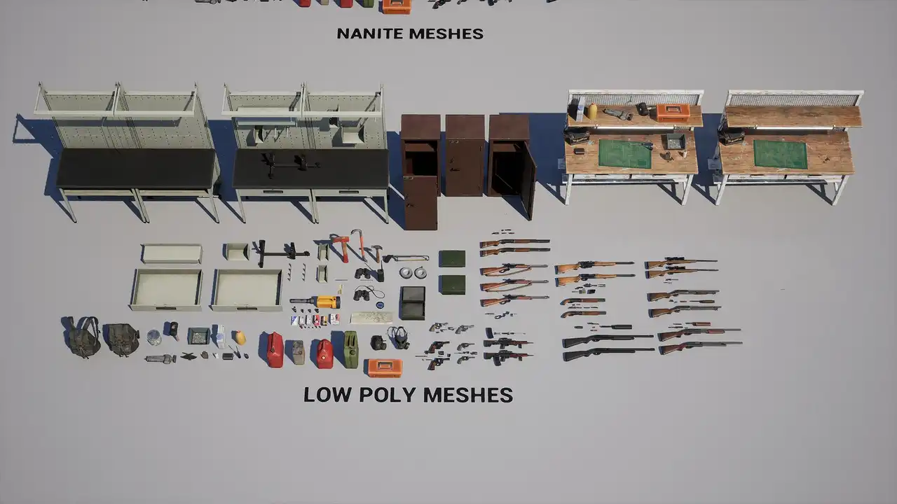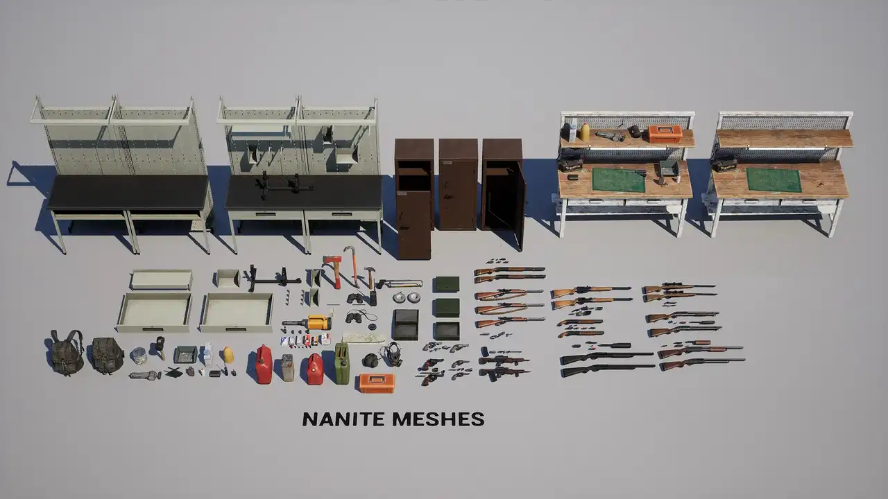 - 适合原因:资源包包含高质量的枪支模型和补给品,适合用于射击游戏中的武器库或安全屋场景。Nanite技术支持高保真渲染,提升游戏画面质量。